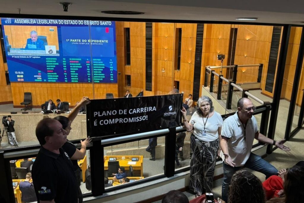 Servidores da Casa têm comparecido rotineiramente à galeria do plenário, onde colocaram uma placa que diz: “Plano de Carreira é compromisso!”. Em postagem nas redes sociais nessa segunda-feira (2), o Sindilegis afirmou que a Comissão de Plano de Cargos e Salários, criada em outubro de 2025 pelo presidente da Assembleia, deputado Marcelo Santos (União), finalizou uma proposta em fevereiro. Entretanto, ainda não conseguiu se reunir com a gestão para validar o documento.