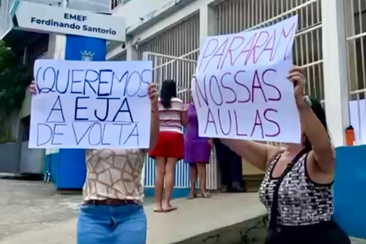 Estudantes da Educação de Jovens e Adultos (EJA) de Cariacica protestaram nessa quarta-feira (25) contra o fechamento da oferta da modalidade na Escola Municipal de Ensino Fundamental (EMEF) Ferdinando Santório, em Vila Capixaba. A comunidade escolar realizou um ato em frente à unidade para cobrar a reabertura do ensino e denunciar a decisão da Secretaria de Educação (Seme) da gestão de Euclério Sampaio (MDB), que classificam como “autoritária” e em “desrespeito aos trâmites legais”.