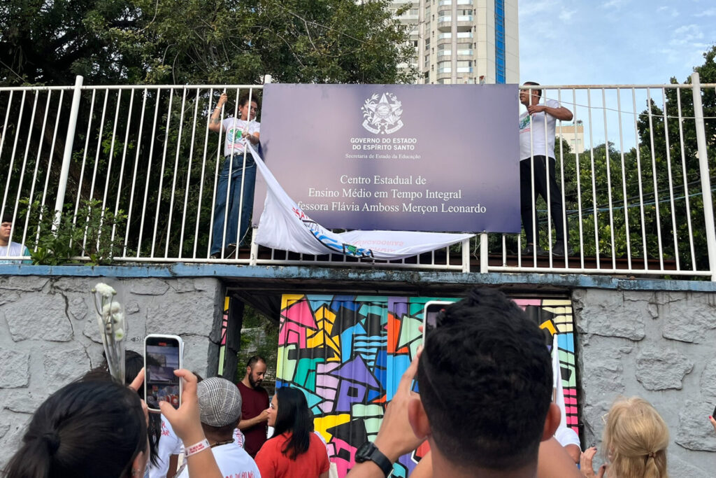 Antes de chegar à Assembleia Legislativa, os manifestantes passaram pela antiga escola Fernando Duarte Rabello, em Santa Helena, que agora passa a se chamar Professora Flávia Amboss Merçon Leonardo. Durante o ato, a placa com o novo nome da unidade de ensino foi inaugurada. Fernando Duarte Rabello, já falecido, foi um ex-reitor da Universidade Federal do Espírito Santo (Ufes) que assumiu o cargo nomeado pelo governo ditatorial. A mudança no nome foi possível após aprovação do Projeto de Lei (PL) 450/2025, de autoria da deputada estadual Camila Valadão (Psol).
