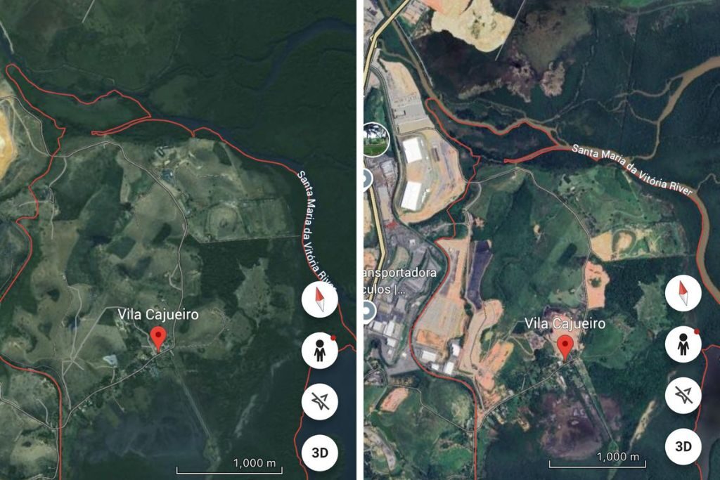 Imagens de satélite mostram o avanço dos aterros sobre o manguezal. À esquerda, a área antes das intervenções; à direita, a ampliação das movimentações de terra e supressão de vegetação próxima ao Rio Santa Maria.