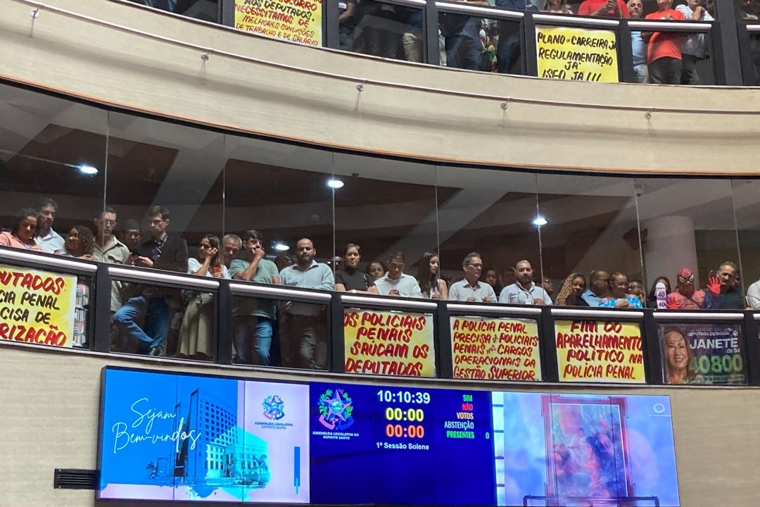 O plenário Dirceu Cardoso ficou tomado para sessão solene de posse dos deputados eleitos para a legislatura 2023-2027. Além dos parlamentares e convidados, a cerimônia foi aberta à população, que acompanhou tudo das galerias, onde também estavam lideranças sindicais pleiteando melhorias salariais.